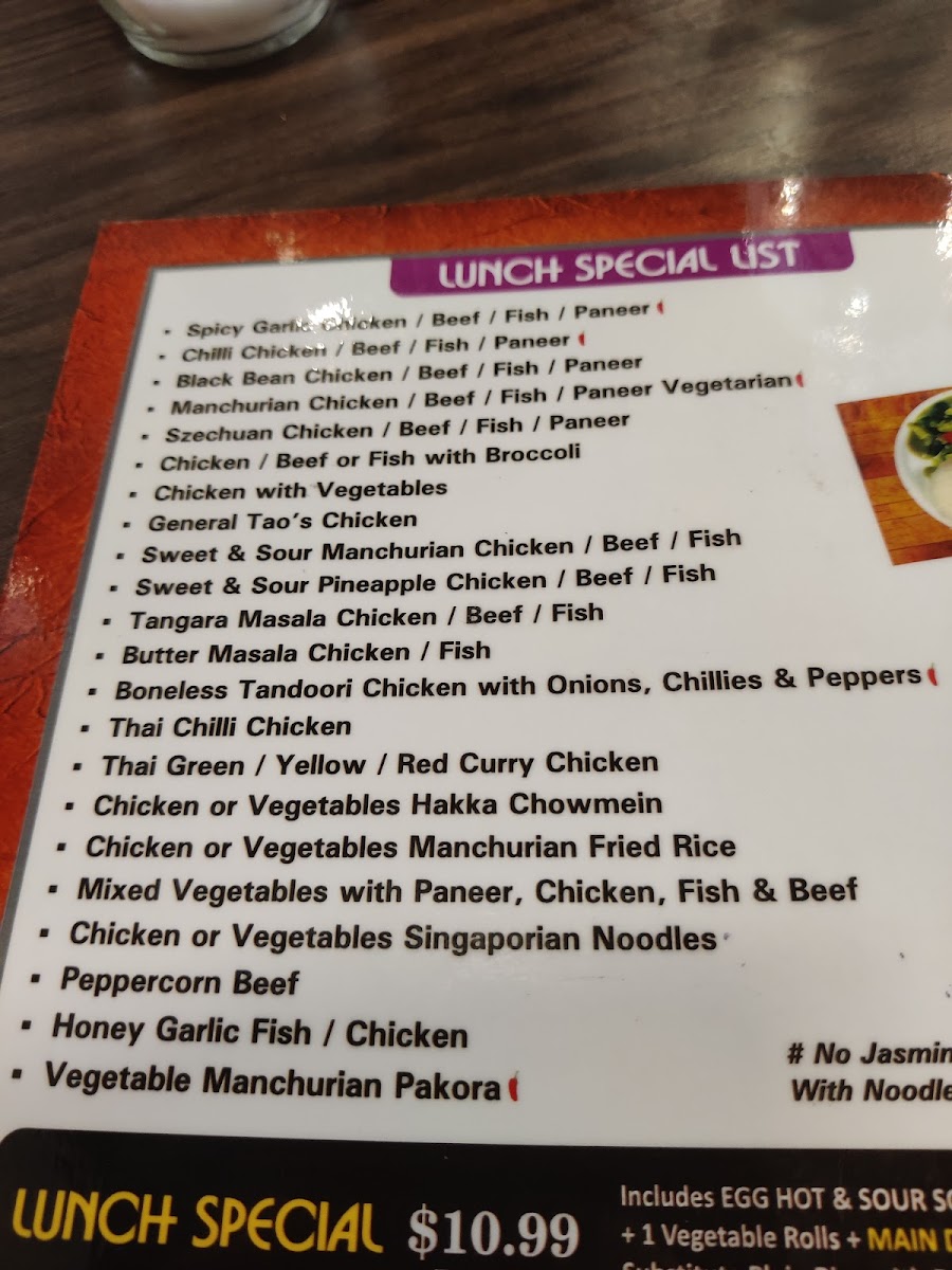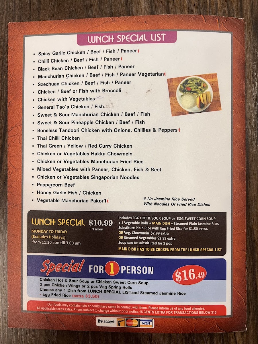 Includes egg hot and sour soup or egg sweet corn soup, two vegetable rolls, main dish, and steamed plain jasmine rice (except for noodle or fried rice dishes).